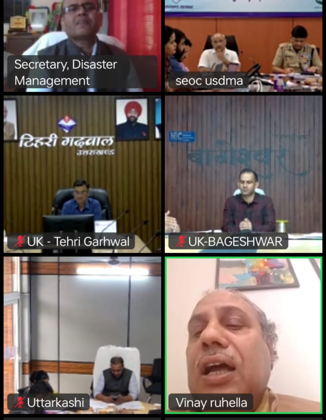 उन्होंने सभी जिलाधिकारियों को निर्देश दिए कि आपदा प्रबंधन के दृष्टिकोण से सभी जनपदों में हर रोज समीक्षा बैठक की जाए। साथ ही स्कूली तथा कॉलेज के छात्र-छात्राओं, के साथ ही व्यापारियों का भी वाट्सएप गु्रप बनाया जाए। इस अवसर पर एसीईओ प्रशासन/अपर सचिव श्री आनंद स्वरूप, एसीईओ क्रियान्वयन डीआईजी श्री राजकुमार नेगी, डॉ. पूजा राणा, श्री रोहित कुमार, श्री हेमंत बिष्ट, डॉ. वेदिका पन्त, श्रीमती तंद्रीला सरकार आदि मौजूद थे।